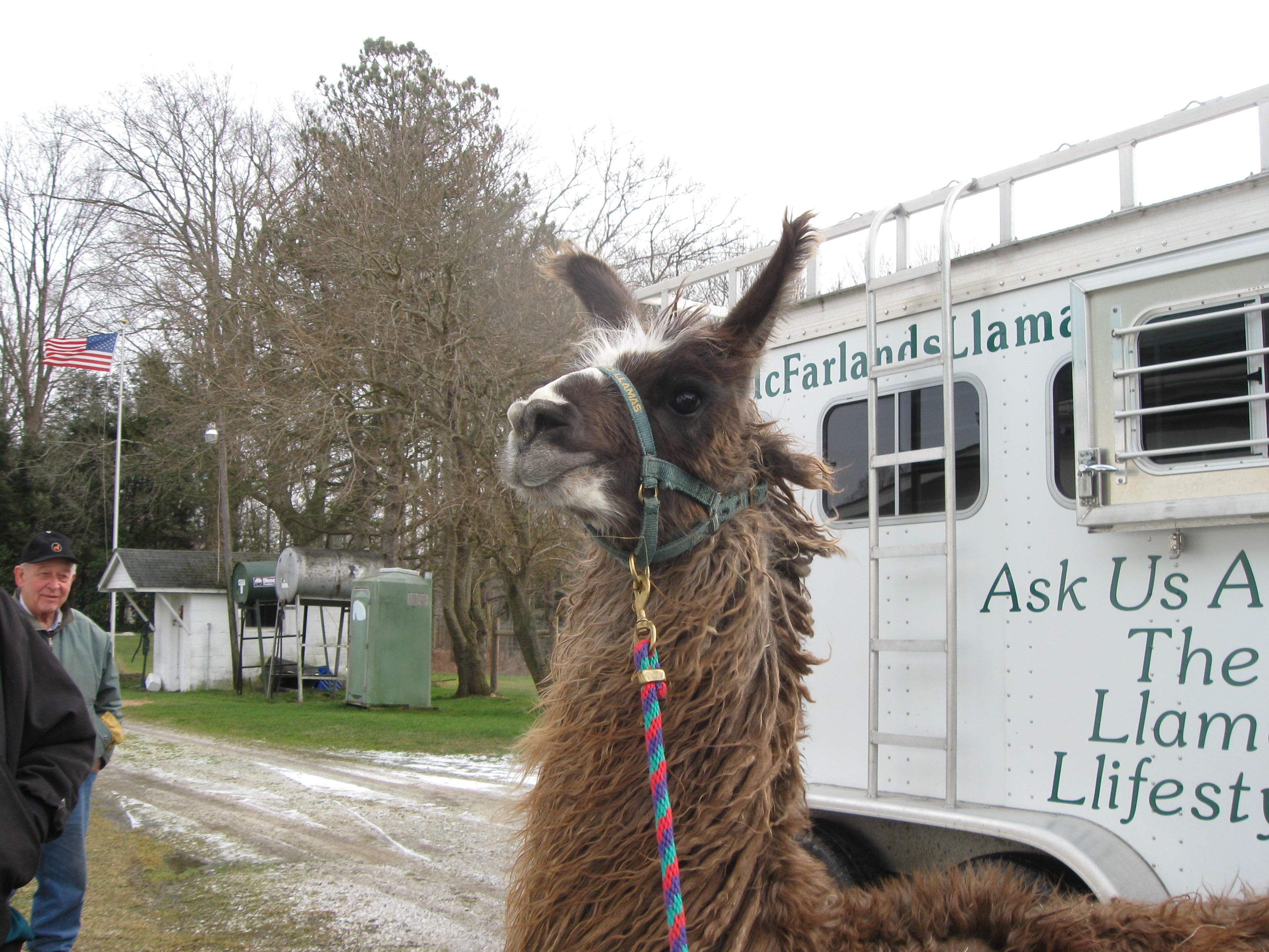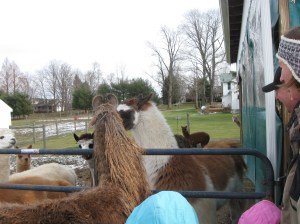 February 2, 2012No Gunsmoke – some Knitting. Attended the arrival of Carmen, a new suri llama at RHL Farms last Sunday. As I understand it, the llamas guard the alpacas and alpacas are what RHL is all about. Carmen was introduced to Bella, the other llama who guards the girls, and to the rest of the female alpacas. Everything went smoothly. At this point the sun was shining, but the day was cold. Actually, perfect weather for the alpacas and llamas and their thick, soft coats.