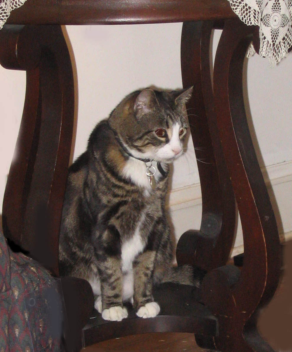 March 9, 2012It is Friday and this is Murphy, showing off his natural ability as a piece of sculpture sitting under a table in the living room. Actually, all cats have this sculptural ability. Murphy is being challenged by new kitty, Sam Vimes, who Murphy finds exhausting in his exuberance. Murphy (age 8), is more solemn and dignified, but he is beginning to hold his own against the youngster.