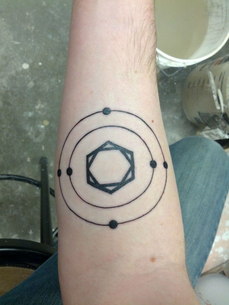 I didn’t want to choose an ordinary representation of carbon for my…uh…lifetime ink commitment. Behold the carbon 60 molecule, which just happens to fit my idea and look ridiculously cool, especially when “unfolded.” I initially wanted the design to be small and discreet, but my tattoo artist thought it was such a cool design that he insisted I get it bigger. I’m happy I took his advice.