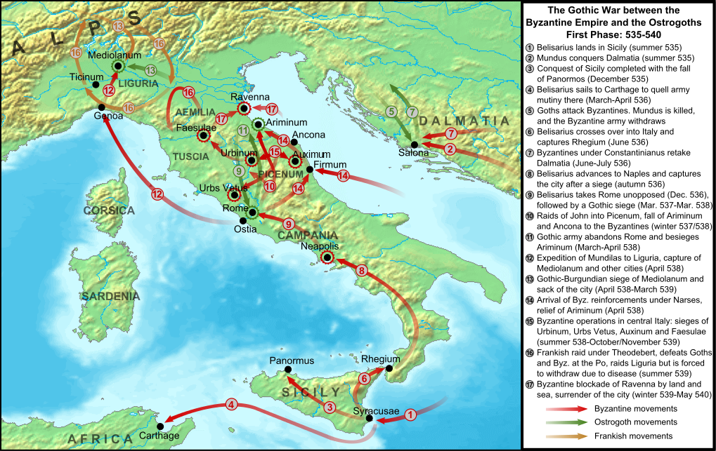 General Belisarius was appointed by Justinian I to take back Rome. He entered Italy from the east and rapidly took Sicily.