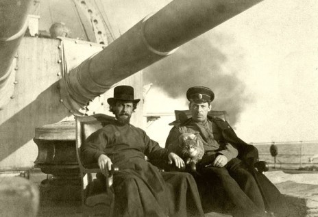 “Priest Solodkov, the ship’s doctor and the ship’s cat on the deck of Kagul, Bizerta, 1921. Kagul (renamed Ochakov, later General Kornilov) was built by Sevastopol dockyard. Laid down 1900, launched October 1902, completed 1905, seized by the White forces in the Russian Civil War and interned in Bizerta in 1920 as part of Wrangel’s fleet, sold for scrap in 1933.