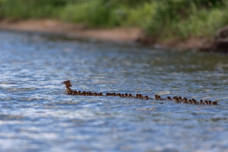 “Minnesota-based wildlife photographer Brent Cizek was headed back to shore before a summer storm when he spotted the common merganser he would later nickname “Momma Merganser.” At first the mother duck was being followed by a brood of more than 50 fluffy ducklings, however when spotted the group again, the total had grown to 76.”