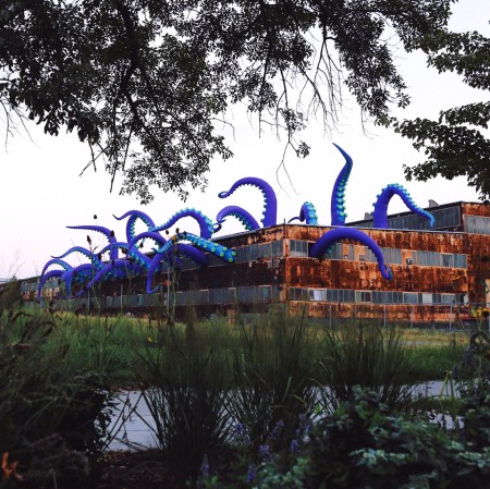 Huge sea monster tentacles protrude from the roof and windows of a warehouse at the former Philadelphia Navy Yard. The installation was perpetrated by UK artists Filthy Luker and Pedro Estrellas. They call it, Sea Monsters HERE. I think it is in a rather fitting location.