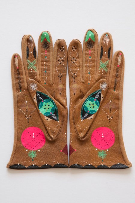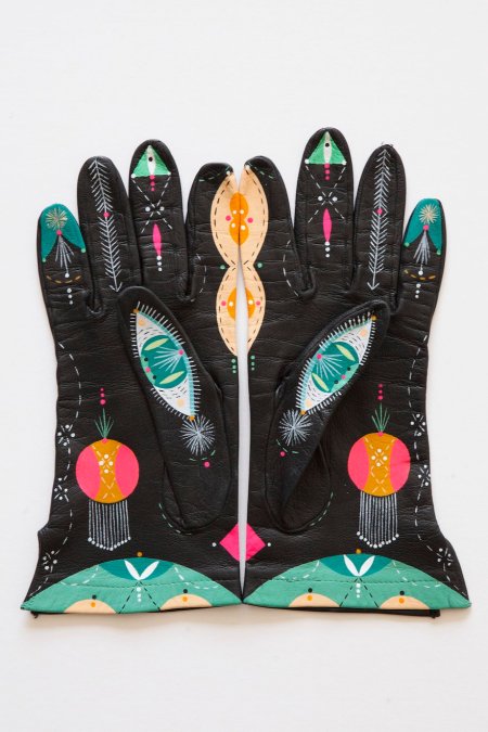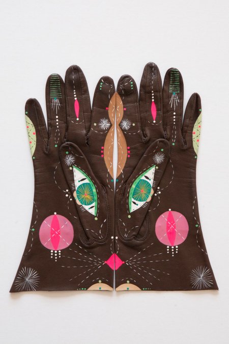 “Artist Bunnie Reiss enjoys transforming the old into new, and has spent her life as a collector of weathered objects with rich stories. Reiss’s ongoing project turns her collection of old leather gloves into bright works of art, utilizing symmetry and cosmic imagery to connect both the past and present. The gloves are not obvious references to animal faces, but subtle gestures that reference eyes, ears, and noses within their design.”