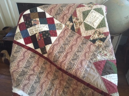My stay-at-home recovery time from knee surgery has given me the opportunity to pick up a hand-quilting project that has been hanging around for a while.  It is a block of the month quilt with quotations that I like in the “signature” areas.  There is still a lot of border to finish, but now I can see that completion may actually happen.  It is nice to sit with the quilt on my lab as I sew.  Cmdr. Sam Vimes likes to supervise.