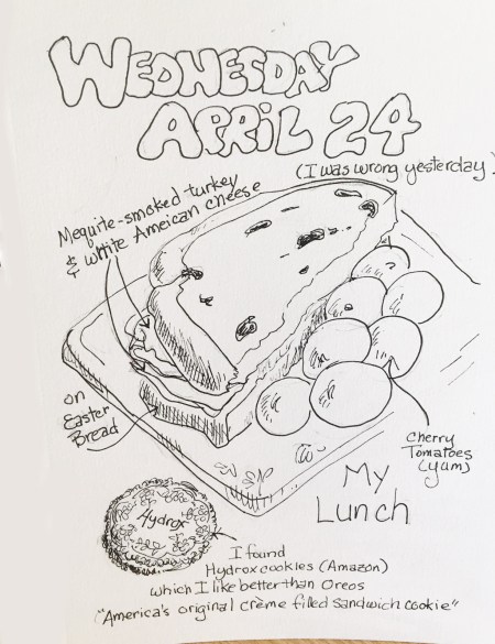 April 24, 2019I have found that I have not been taking the time to draw, so to compensate, I am drawing my lunch. I try to do it everyday.