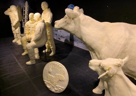The Ohio State Fair this year featured a life size rendition of the Apollo 11 moon landing to commemorate its 50th anniversary. Also included were the three Apollo 11 astronauts, Neil Armstrong (an Ohio boy), Buzz Aldrin and Michael Collins. They were joined by a butter cow and calf. Collectively, the display used 2,200 pounds of butter.