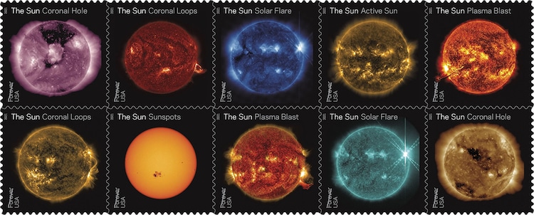 The United States Postal Service has recently issued a new set of stamps depicting different aspects of our Sun . . .