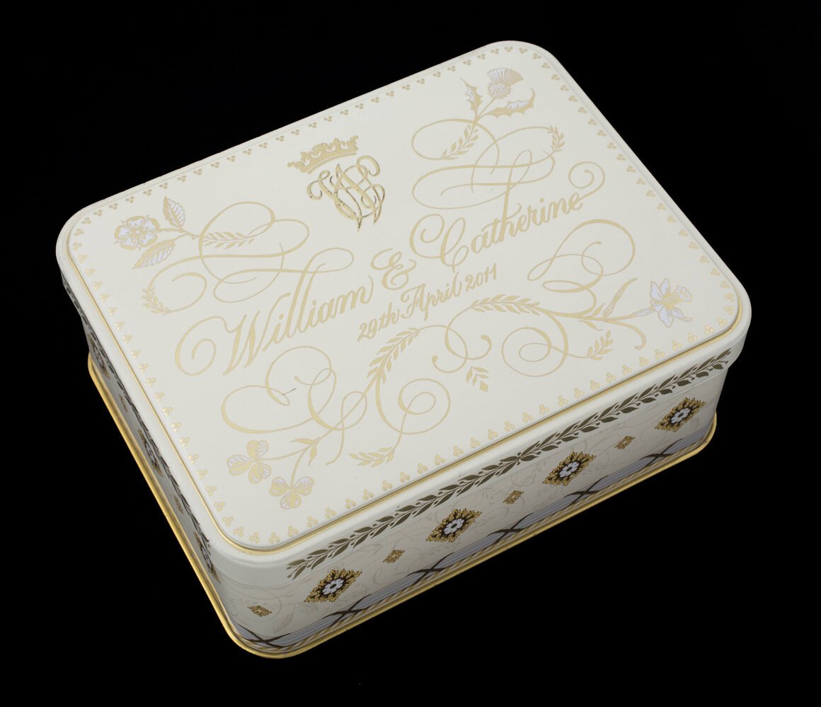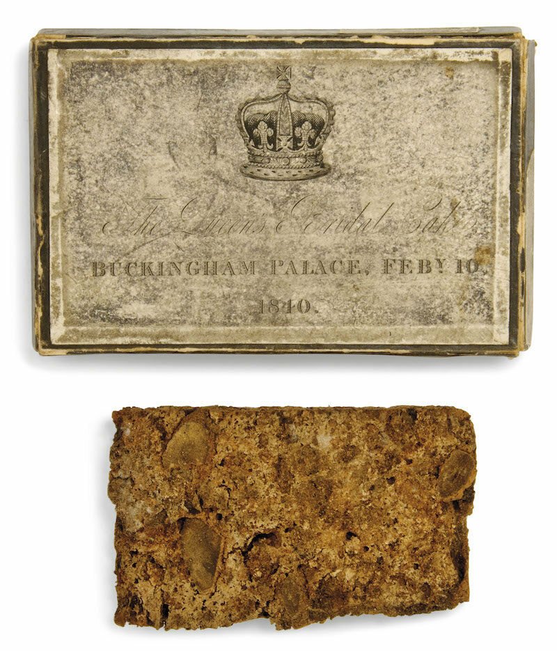 Slices of wedding cake from English royal weddings are given to guests in little boxes. The slices may be consumed, of course, or kept as mementos of the occasion. Keeping them is what many people do and,