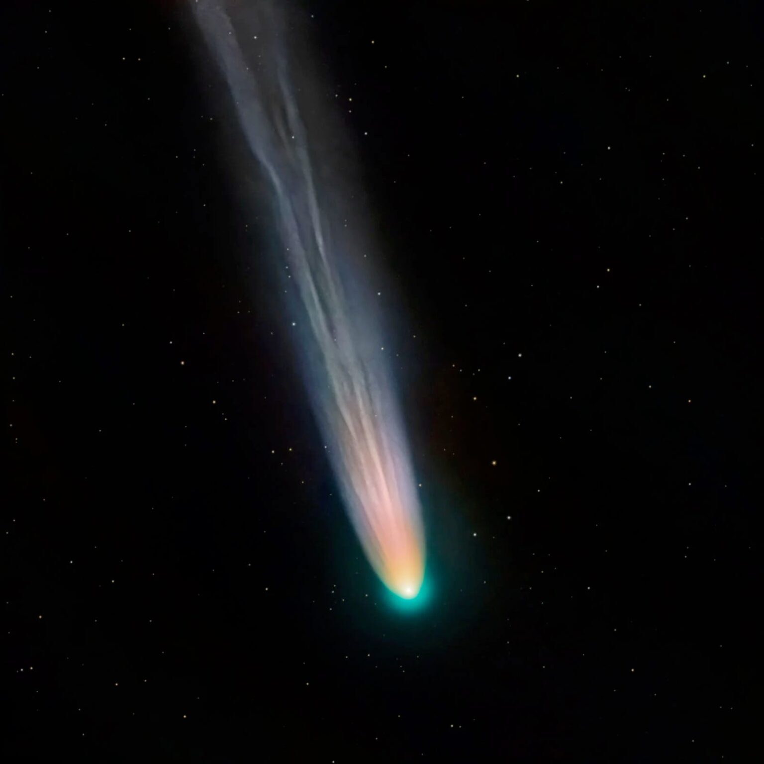 “Set against a star-studded backdrop, Comet Leonard, aka the Chrismas Comet, blazed overhead on December 26, emitting a colorful stream of light that illuminated the dark skies. Andrew McCarthy documented the celestial body as it hurtled over the Arizona horizon and created this striking, magnified composite of 25 separate shots. The image, along with a wider photo shown below, captures the brilliant colors surrounding the nucleus as it flies 150,000 miles per hour through space. Comet Leonard was first spotted about 466 million miles away on January 3, 2021, and is making its closest pass to the sun exactly one year later, before it’s expelled from our solar system entirely.”