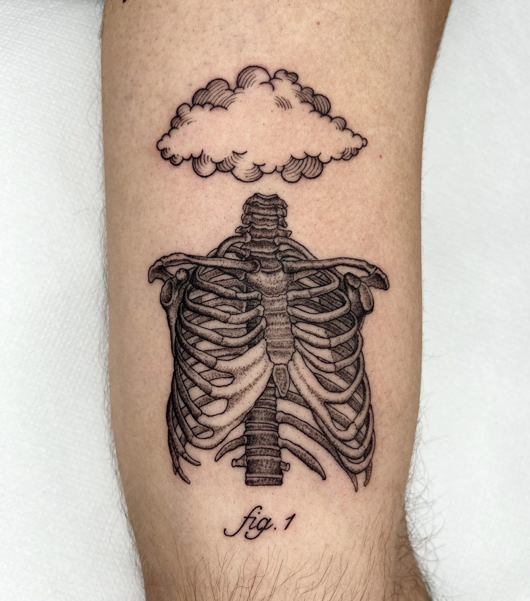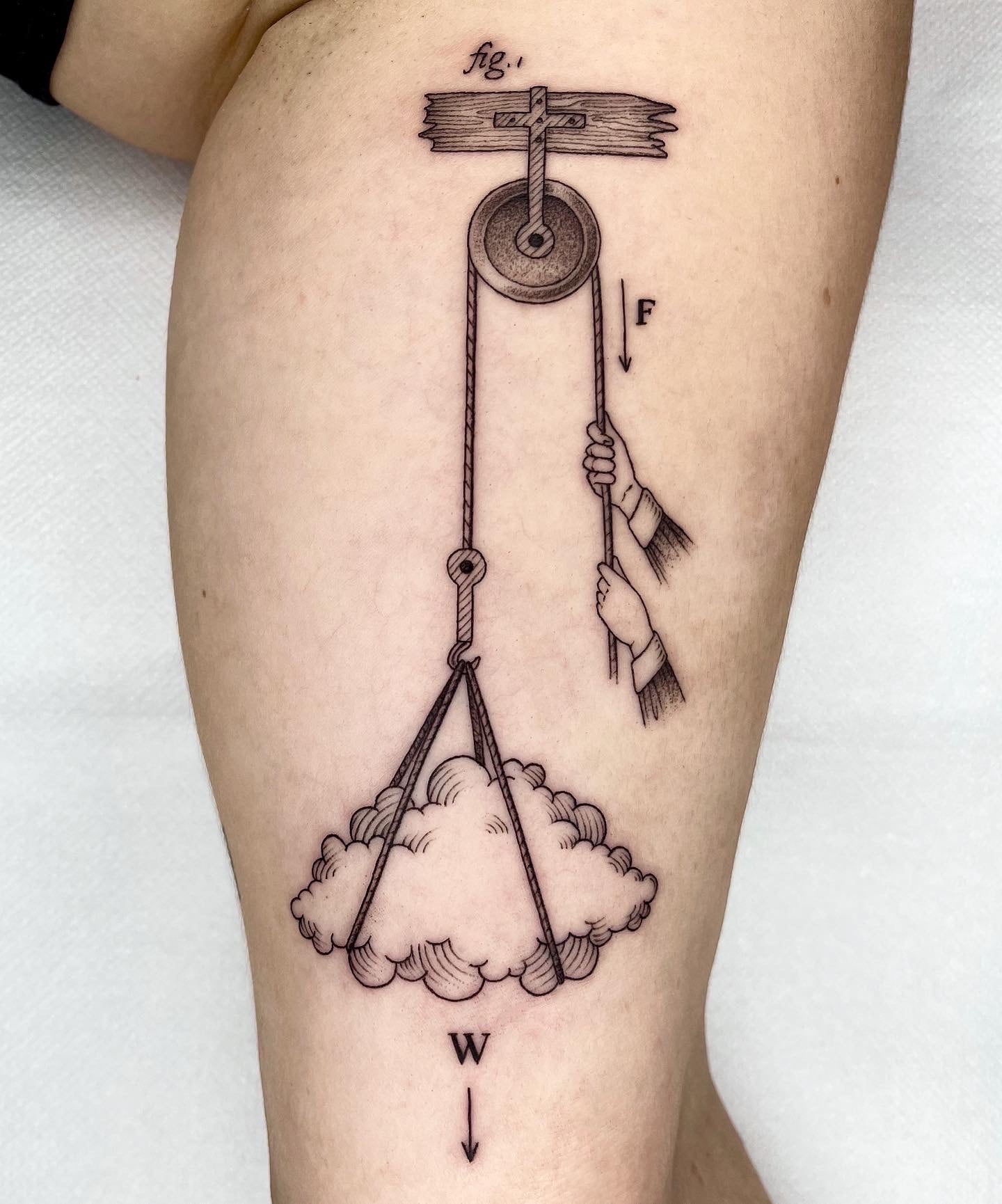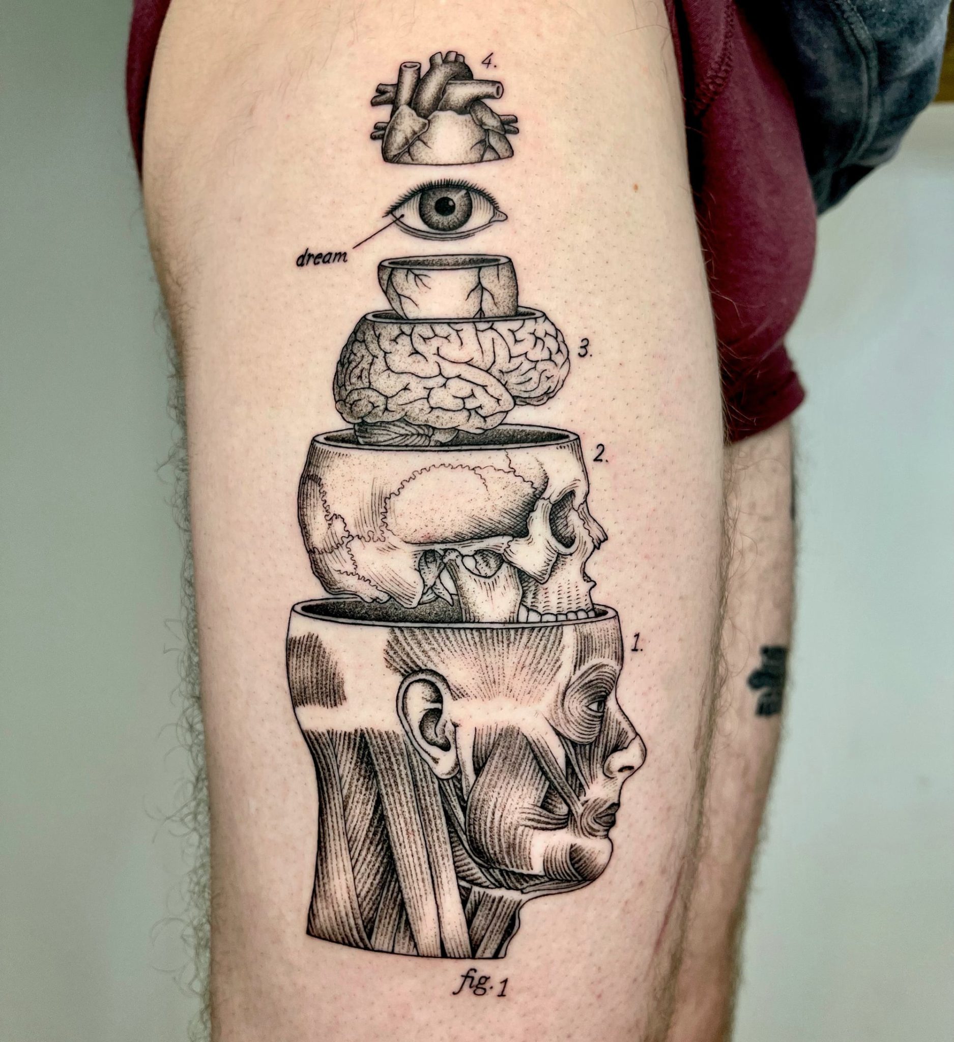 “Bologna-based artist Michele Volpi (previously) inoculates his monochromatic tattoos of anatomical figures and biological diagrams with a dose of the surreal. Working in black ink, Volpi renders exquisite scientific illustrations across botany, astronomy, physiology, and chemistry with precise detail. He uses intricate linework and stippled shading to create realistic renderings of human skeletal systems and weather cycles, while skewing the scale or pairing seemingly disparate subject matters to achieve the more unusual qualities.” – Colossal