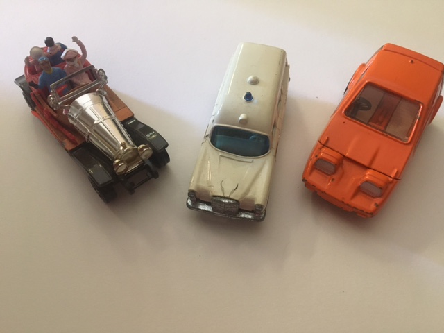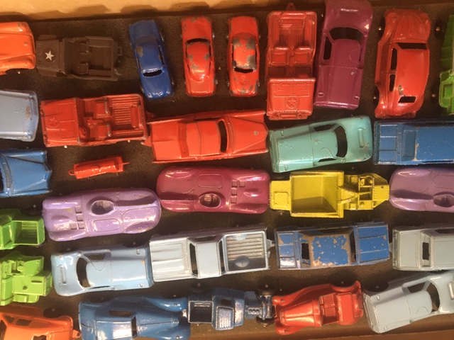 A bunch of Matchbox, Dinky and die cast metal cars and trucks. Not collectible, but all well loved and enjoyed by my brother and then my son. This is just a tiny sampling of their treasures. Only valuable for sentimental reasons.