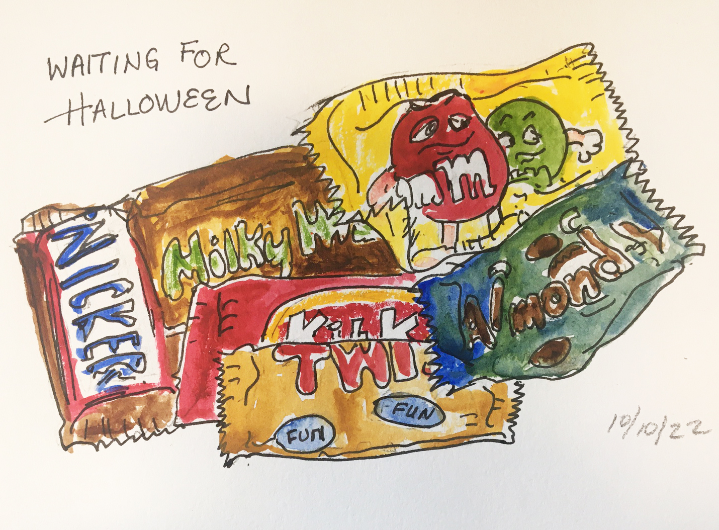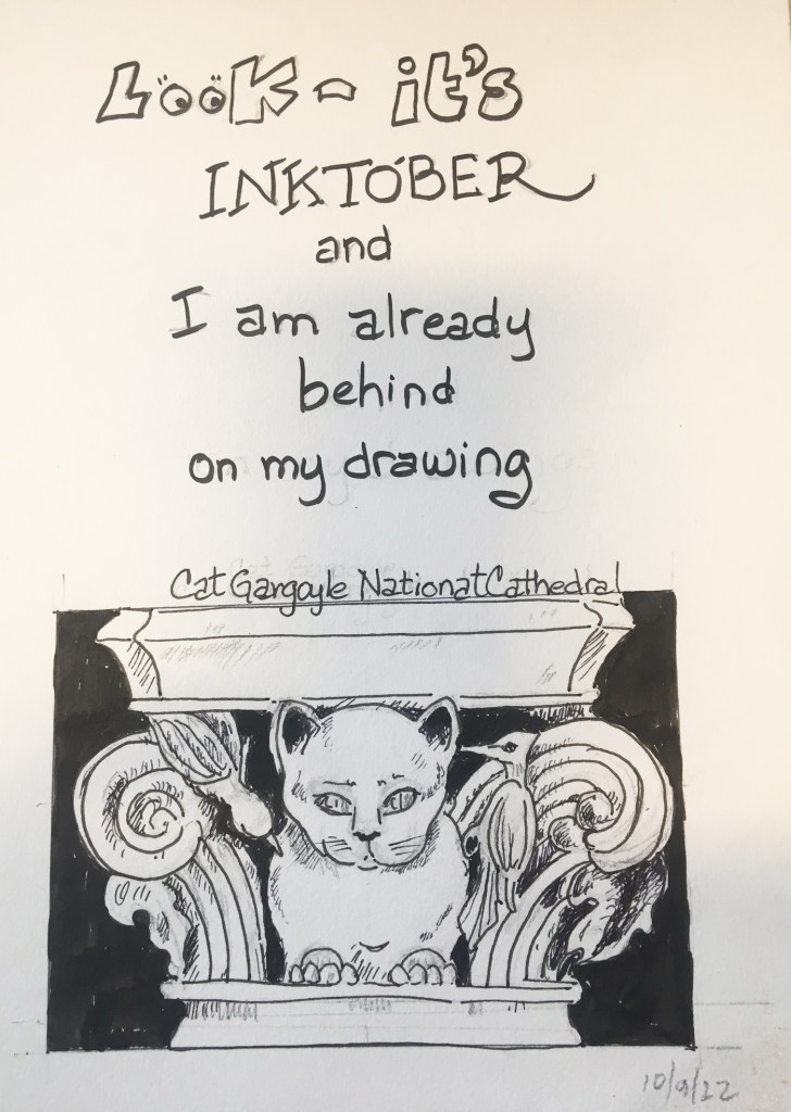 Inktober is an activity for which you sign up (or not) and intend to draw something everyday during the month of October. This is something I try to do anyway – drawing my lunch was my usual activity – but I have let that slide and I decided to participate in Inktober this year. As you can see, I am behind in my drawing, but will try to catch up