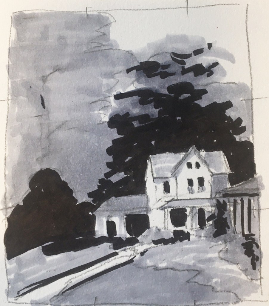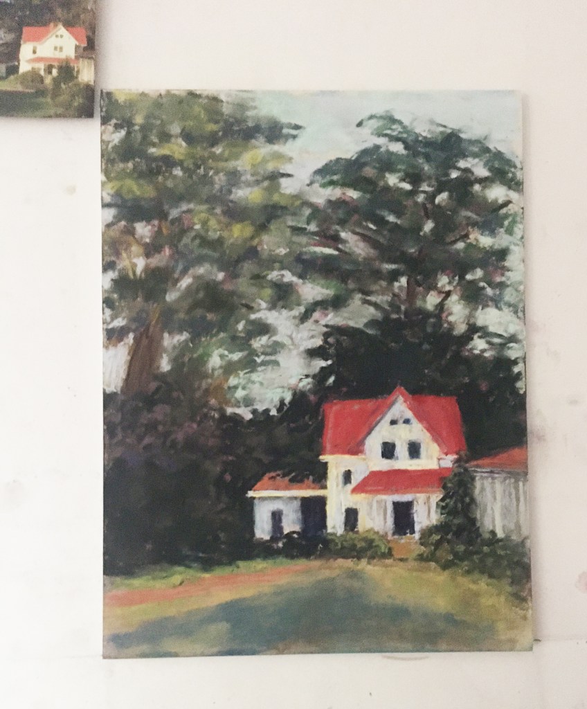 This is my tonal sketch (black and white), photograph (the little one) and my pastel painting of a cottage on the Presidio grounds in San Francisco. I am counting it because I worked on it earlier this month.