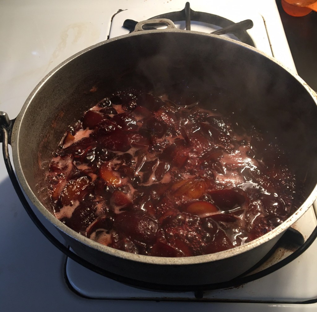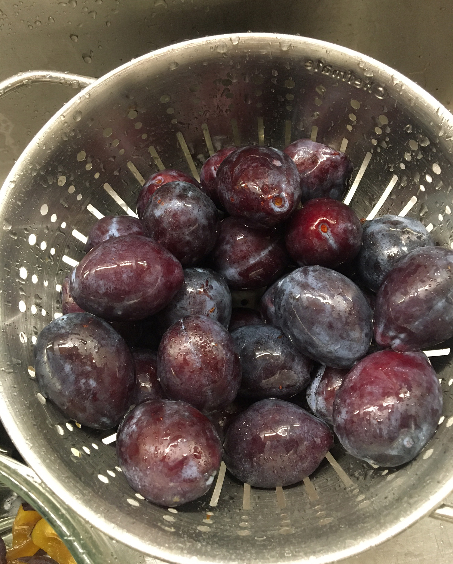 I am intrigued by the small yield of this recipe, but “normal” jamming calls for an equal amount of fruit and sugar when working with pectin. In this batch, I used 3 pounds of plums, 1 1/2 cup of sugar, the juice of one huge lemon – that’s it. I wound up with about 4 – 8 oz. jars of preserves. The preserves are incredibly good.