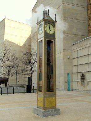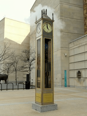 This steam powered clock in Indianapolis, Indiana plays “Back Home in Indiana” through its steam whistles at the beginning of each hour. There is more to the story including links to other steam powered clocks at Atlas Obscura