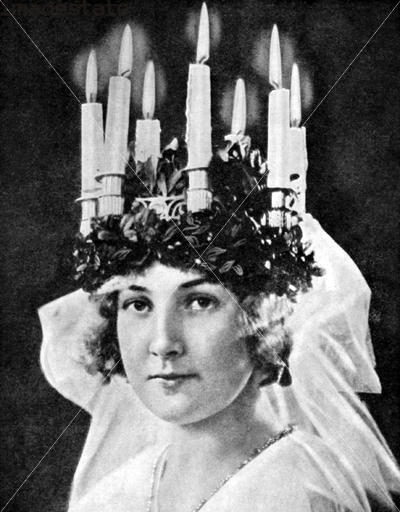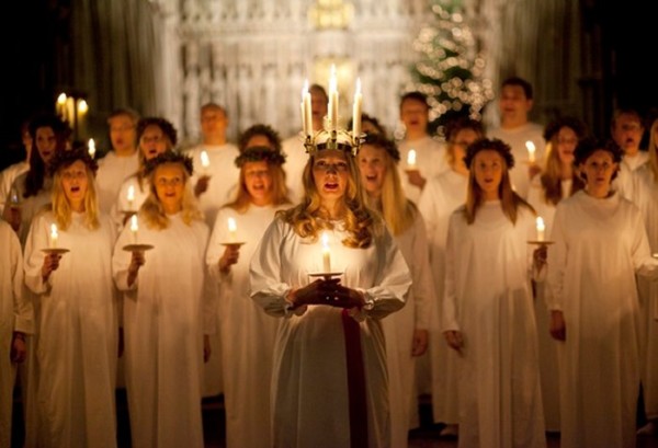 I think the white dresses and red sashes on young girls who bear platters of saffron buns is a lovely image. The thought of children wearing a crown of lighted candles on top of their long, flowing hair, however, is terrifying.