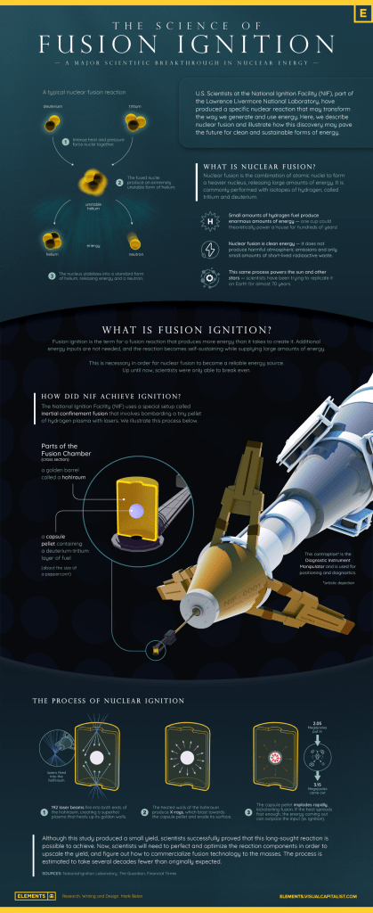 Following up on the recent announcement that a nuclear fusion reaction has been accomplished that yielded a net increase in energy (!) I offer this explanation of the reaction from Visual Capitalist.