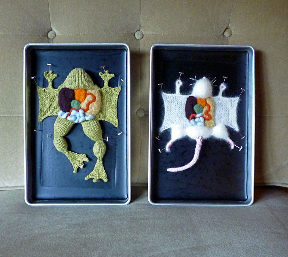 Vermont-based knitter Emily Stoneking runs an anatomical knitting brand called aKNITomy where she transforms fluffy skeins of yarn into the anatomical details of rats, frogs, people, and other creatures. Stoneking—who is admittedly not a scientist—likes to approximate the form and style seen in most anatomical illustrations with clear colors and distinct forms that may not be 100% accurate but are fun to look at nonetheless.
