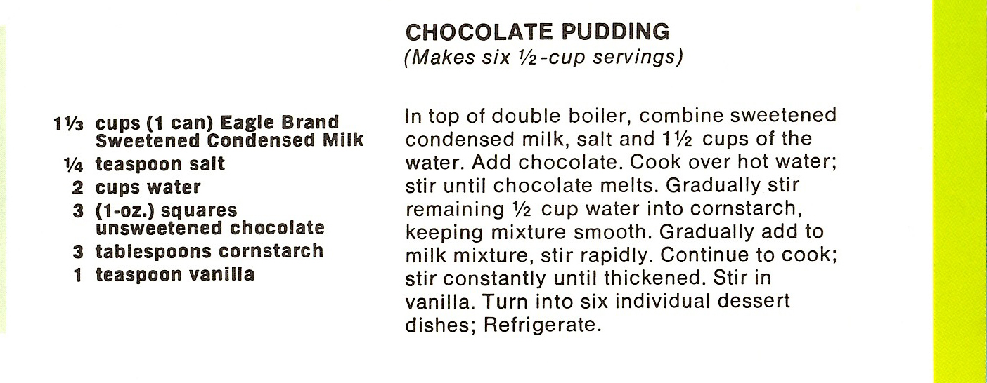 From The Dessert Lovers Handbook (a vintage cookbook from my collection), here is a recipe for chocolate pudding.