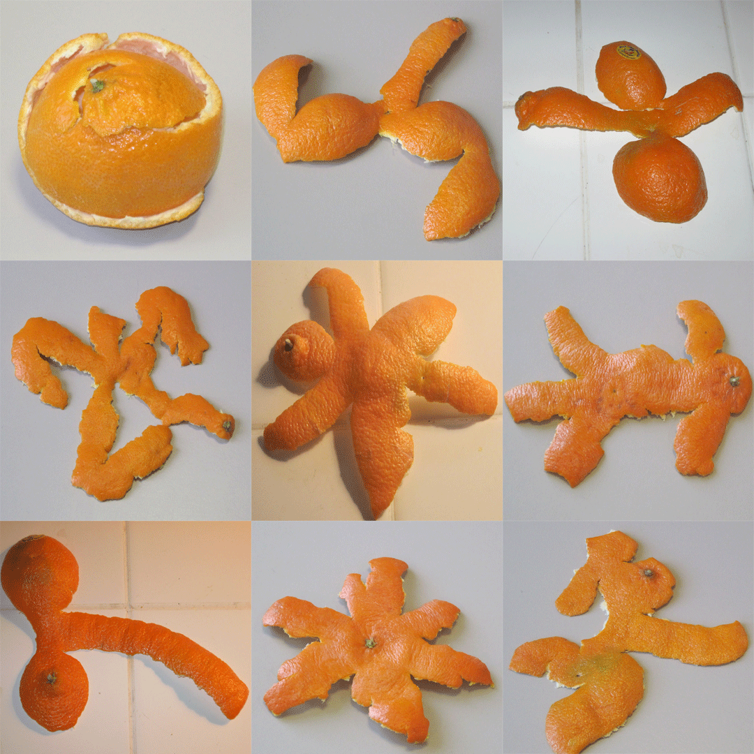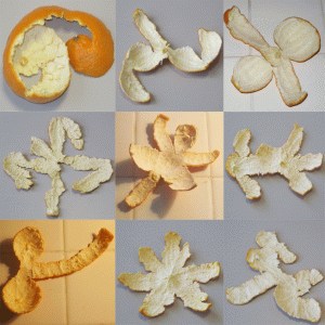 Not only are they delicious, they also are the inspiration for an art project. In the galleries below, there are nine examples (front and back) of clementine peels manipulated into a variety of shapes. The two rules for creating these objects are: 1. use only fingers to peel the clementine, and 2. extract the fruit keeping the peel and the fruit in one intact piece.