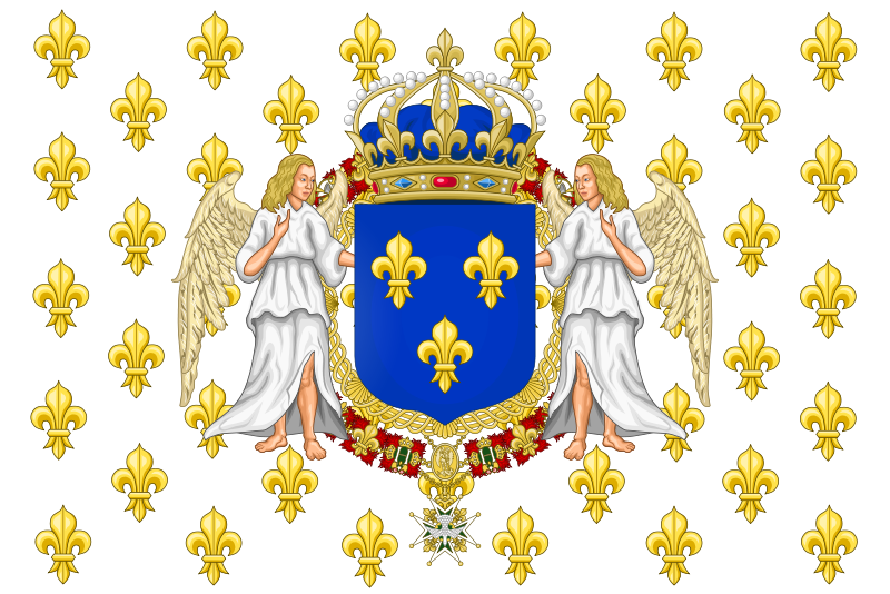 The fleur de lis is a stylized lily. It figures prominently in heraldry, particularly in European royal coats of arms, such as on this flag of the Kingdom of France.