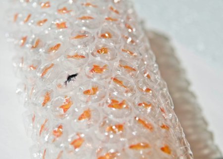 “Inspired by watching a single goldfish swimming around in a goldfish bowl, Japanese designer Daisuke Akiyama came up with a rather ingenious product: goldfish bubble wrap. By reinventing the standard packaging material, Akiyama – part of the design studio HAFT DESIGN – created the subtle yet magical illusion of miniature goldfish swimming around in each bubble. “We usually have an inclination to pop bubble wrap,” says Akiyama. “But by printing goldfish I’ve made it psychologically more difficult to pop.”