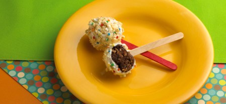 5. Insert lollipop stick or ice cream stick into each chocolate ball. Working with 1 ball at a time, spoon white chocolate mixture over each, allowing excess to drip off. Press KELLOGG’S POP TARTS Frosted Confetti Cupcake toaster pastry pieces into white chocolate. Place on baking sheet lined with wax paper. Refrigerate at least 15 minutes or until firm.