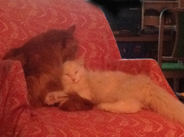 They are both Maine Coon cats and are still growing. Sammy is 2 years old and Hobbes is only 9 months old. They are terrific companions for each other and are great fun to watch.