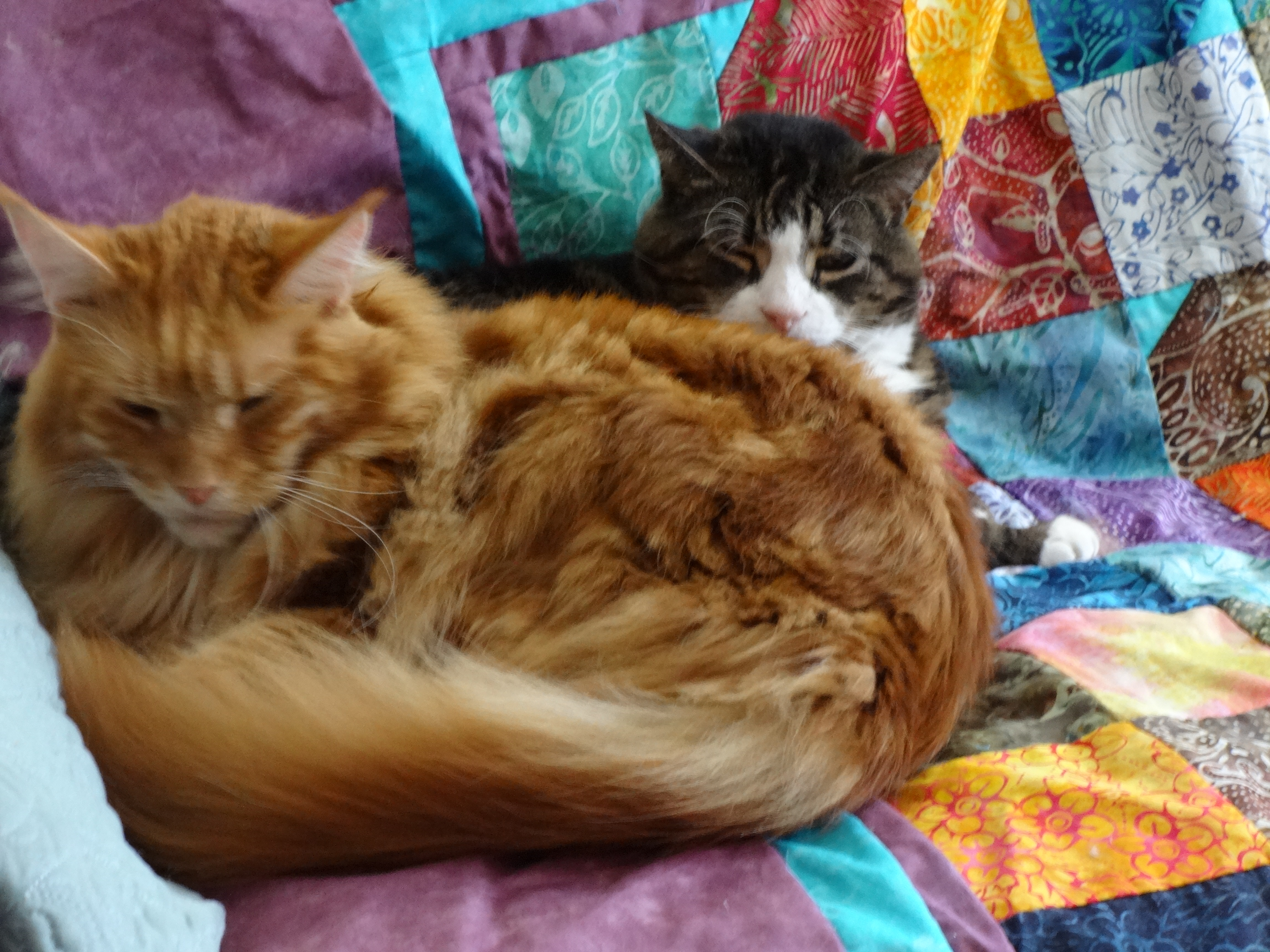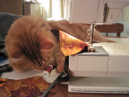 My stay-at-home recovery time from knee surgery has given me the opportunity to pick up a hand-quilting project that has been hanging around for a while. It is a block of the month quilt with quotations that I like in the “signature” areas. There is still a lot of border to finish, but now I can see that completion may actually happen. It is nice to sit with the quilt on my lab as I sew. Cmdr. Sam Vimes likes to supervise.