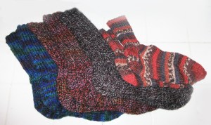 My words of advice – buy the best yarn you can afford. There are great washable wool and other luxury blended fiber yarns available. Natural fibers feel SO much better (and wear better) than the cheap stuff. Most socks only take one skein or ball of yarn – 2 at the most – so go ahead and splurge. I (now) make sure that the yarn is washable and sturdy enough to handle the wear that socks get. Still, I wash them in cold water on gentle and hang them up to dry.