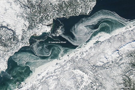 The Lachine Rapids are a series of rapids on the Saint Lawrence River, between the Island of Montreal and the south shore. They are located near the former city of Lachine. The Lachine Rapids contain large standing waves because the water volume and current do not change with respect to the permanent features in the riverbed, namely its shelf-like drops. Seasonal variation in the water flow does not change the position of the waves, although it does change their size and shape. The rapids are about 3 miles (4.8 km) in length. In the past these represented a considerable barrier to maritime traffic. Until the construction of the Lachine Canal through Montreal, the rapids had to be portaged.